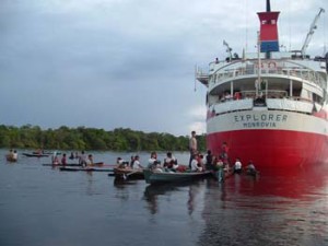 Here, people are disembarking the ship to explore a local village.